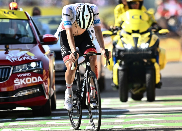 Après sa chute, Pogacar, touché sur le côté gauche, un filet de sang sur la cuisse, est resté le plus souvent dans la roue de Vingegaard avant de lâcher prise à 4,4 kilomètres de la ligne.
