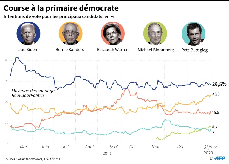L'Iowa sera le premier Etat à voter lundi soir pour choisir le candidat démocrate qui défiera Donald Trump lors de la présidentielle de novembre. A la veille du vote, bénéficiant d'un grand soutien des jeunes, Bernie Sanders restait en tête des sondages portant sur cet Etat rural peu peuplé mais très influent. Il devance l'ancien vice-président Joe Biden (77 ans), l'ex-maire Pete Buttigieg (38 ans) et la sénatrice progressiste Elizabeth Warren (70 ans).