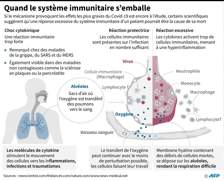 Pour la seconde phase des formes graves de Covid-19, moins marquée par l'action du virus que par une réaction inflammatoire incontrôlée de l'organisme, dite "orage cytokinique", une autre famille de médicaments est testée: les immuno-modulateurs, dont le tocilizumab, le sarilumab ou encore l'anakinra. Ce sont des anticorps monoclonaux, créés à partir de souris dont le système immunitaire a été "humanisé". Exposées à des virus vivants ou atténués, elles produisent des anticorps humains, ensuite multipliés en laboratoire.