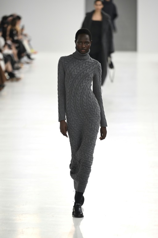 Pulls et robes en tricot torsadé et côtelé sont omniprésents sur les podiums milanais cette saison, tout en restant glamour. Max Mara propose une robe en tricot torsadé gris s'enroulant sur le corps, avec un motif en diagonale pour mieux suivre les courbes.