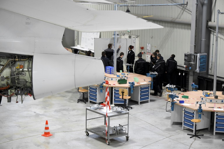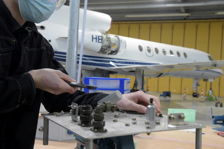 Un peu plus d'un an après son inauguration en septembre 2019, le site de 8.000 m2 a des allures d'école fantôme. Dans le vaste hangar qui abrite un avion d'affaires Falcon et un hélicoptère Super Puma pour les travaux pratiques, seule une vingtaine d'apprentis s'activent autour d'établis.