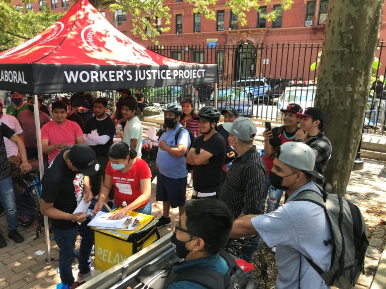 Ils sont devenus "travailleurs essentiels" avec la pandémie, et revendiquent désormais des droits: les livreurs de nourriture new-yorkais, surnommés "deliveristas" car essentiellement d'origine hispanique, en ont assez d'arpenter les rues à deux-roues par tous les temps, sans toucher le salaire minimum ou même avoir accès à des toilettes.