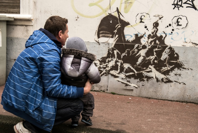 Banksy, considéré comme l'un des plus grands artistes de street art, a réalisé trois oeuvres consacrées aux migrants à Calais, deux en centre-ville et une dans la "Jungle", a constaté samedi un photographe de l'AFP.