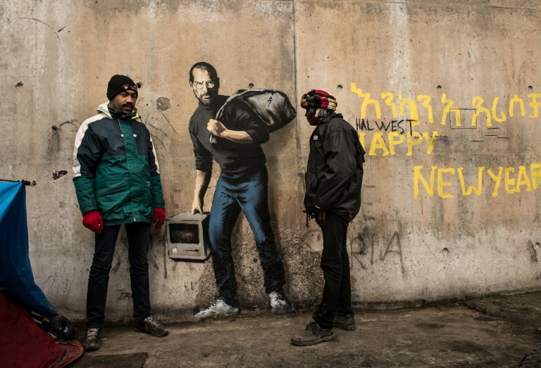 A l'entrée de la "Jungle", la première oeuvre du Britannique, qui cultive le secret, représente le créateur d'Apple Steve Jobs (1955-2011), qui porte un baluchon sur son épaule gauche et un ordinateur caractéristique des années 1980 de la main droite, à côté de plusieurs tentes où vivent quelques-uns des 4.500 migrants du campement.
