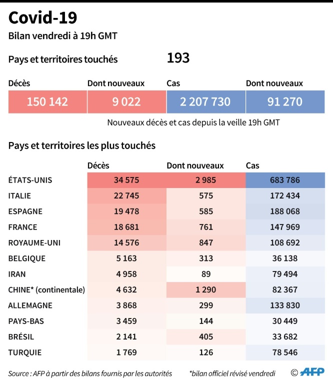 Avec près de 3.000 morts par jour et plus de 34.600 décès au total, les Etats-Unis sont devenus le pays le plus durement touché par la pandémie partie fin 2019 de Wuhan, en Chine. Alors que la marque globale des 150.000 morts a été franchie, les dirigeants mondiaux font face à un double défi sanitaire et économique: une récession sans précédent depuis 1929 menace, a prévenu le Fonds monétaire international (FMI).