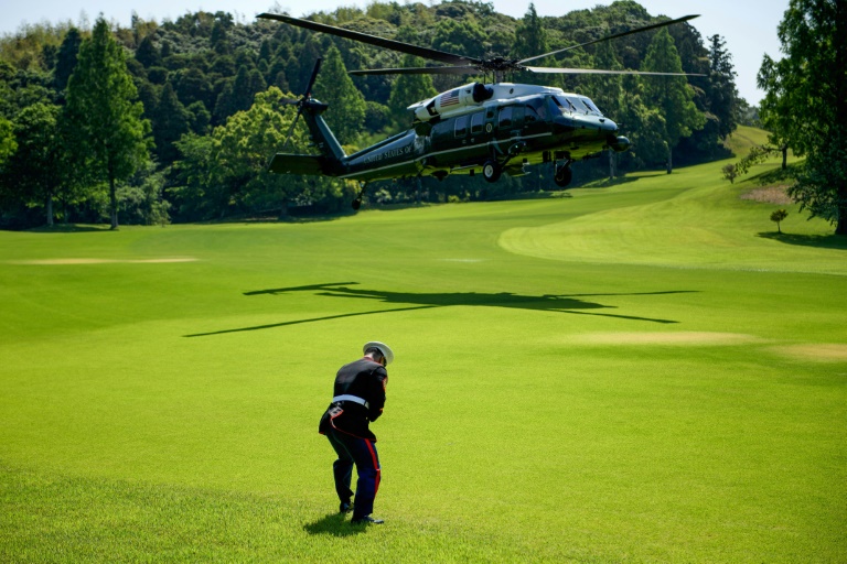 Par une chaleur déjà écrasante dès le matin, avec des températures promettant de dépasser 30 degrés, et sous un ciel sans nuages, l'hélicoptère Marine One s'est posé dans un bruit de tonnerre sur le gazon du paisible club de golf Mobara dans la préfecture de Chiba près de Tokyo.