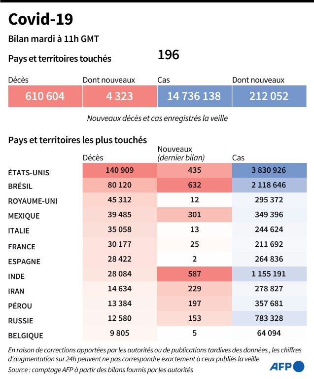 Les Etats-Unis ont enregistré mardi pour le huitième jour consécutif plus de 60.000 nouveaux cas de contamination au coronavirus en l'espace de 24 heures, selon le comptage de l'université Johns Hopkins. Le total atteint 3,89 millions de cas positifs.