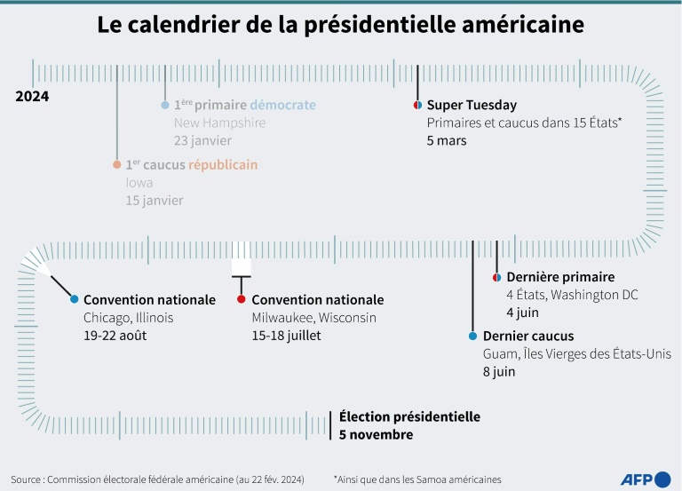Côté démocrate, le président Joe Biden, 81 ans, est candidat à sa réélection et ne fait face à aucune opposition sérieuse.