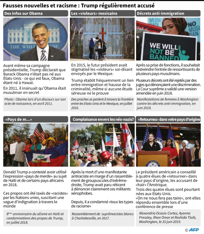 Par rapport à la semaine dernière, sa cote de popularité dans l'ensemble de la population est restée stable, à 41%. Pour Joe Biden, vice-président sous Barack Obama et candidat à l'investiture démocrate pour 2020, aucun président dans l'histoire américaine "n'a été aussi ouvertement raciste que cet homme". "Pouvez-vous imaginer un président conservateur comme George W. Bush faire de telles déclarations racistes?", a lancé Bernie Sanders, qui espère lui aussi porter les couleurs démocrates lors de la prochaine présidentielle.