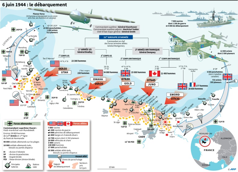 Etape clé de la libération de l'Europe du joug nazi, le débarquement du 6 juin 1944 est le plus important de l'histoire par le nombre de navires engagés: 6.939 navires ont débarqué 132.700 hommes sur les plages de Normandie. Près de 3.000 civils normands ont perdu la vie les 6 et 7 juin, soit presque autant que de militaires alliés le Jour J.