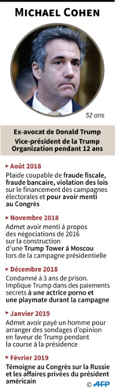Mercredi, les membres de la commission d'enquête de la Chambre --où siègent les élues de l'aile gauche et figures ultra-médiatiques du parti démocrate Alexandria Ocasio-Cortez et Rashida Tlaib-- devrait l'interroger à l'envi sur les finances de l'Organisation Trump, pour laquelle il a travaillé pendant dix ans, les déclarations d'impôts du promoteur, les comptes douteux de sa fondation et un projet de construction à Moscou en 2016. Sans oublier les 280.000 dollars qu'il a versés lors de la campagne à deux femmes, l'ancienne actrice pornographique Stormy Daniels et la playmate Karen McDougal, pour acheter leur silence sur leurs liaisons supposées avec le milliardaire.