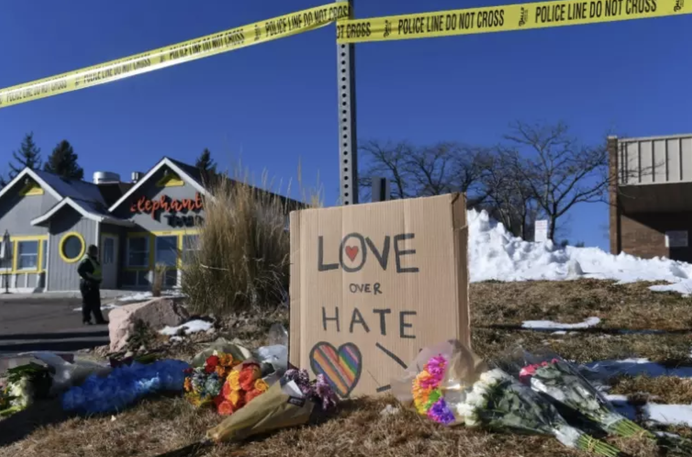 Dans cette ville de l'Etat du Colorado aux portes des Rocheuses, des bouquets de fleurs, des bougies et des pancartes arborant des messages "L'Amour plutôt que la Haine" jonchaient le sol près du Club Q, témoignant du choc et de la consternation provoquée par cette fusillade, une de plus dans cette Amérique régulièrement frappée par des massacres à armes à feu.