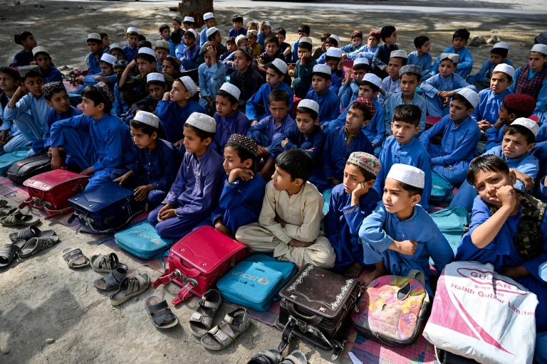 Dans les zones reculées, la classe se fait parfois en extérieur à l'ombre des arbres, voire aux abords d'un cimetière comme dans le village de Mohmand Dara, dans la province de Nangarhar.