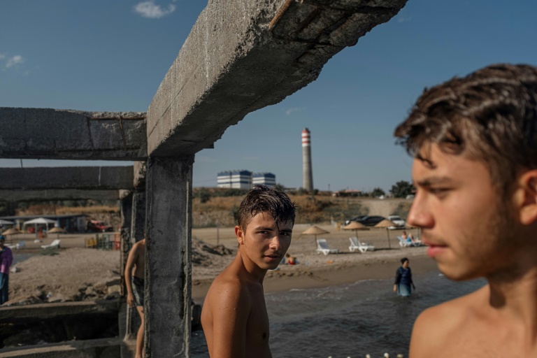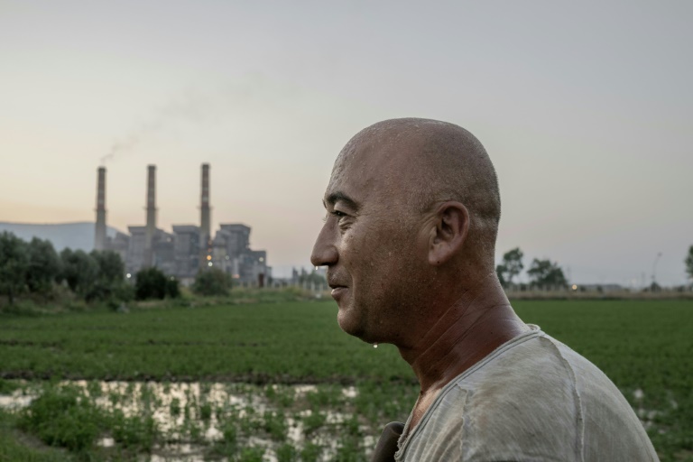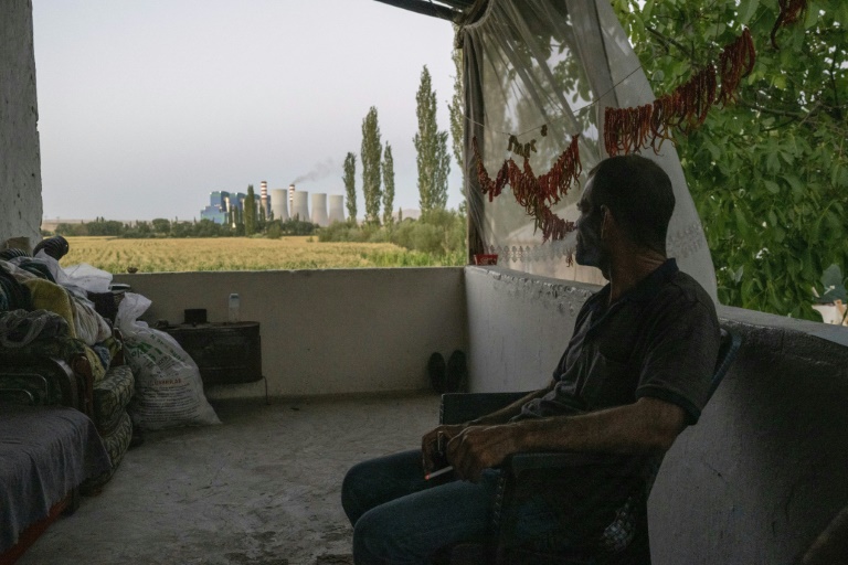 Osman Arslan prépare son thé agenouillé au pied d'un arbre de bon matin, alors que se dresse derrière lui une centrale électrique à charbon qui s'élève comme une bête au-dessus de son village turc de la côte égéenne.
