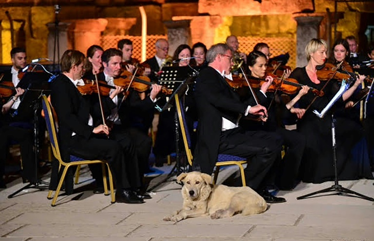 La scène se déroule la semaine dernière près d'Izmir, dans l'ouest de la Turquie : alors que l'Orchestre de chambre de Vienne dirigé par le Suédois Ola Rudner joue la quatrième symphonie de Mendelssohn, le chien monte sur scène, l'air absorbé par les notes.