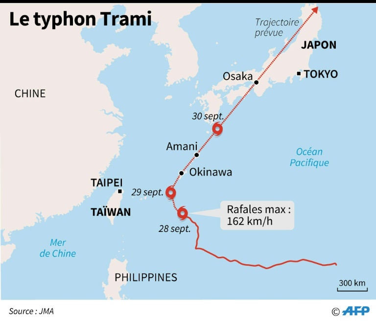 Appelé Trami, ce typhon avec des vents mesurés à 216 km/h a atteint l'île principale de Honshu tôt dimanche, et devrait provoquer de fortes intempéries dans de nombreuses régions jusqu'à lundi. C'est le 24e typhon de l'année en Asie.