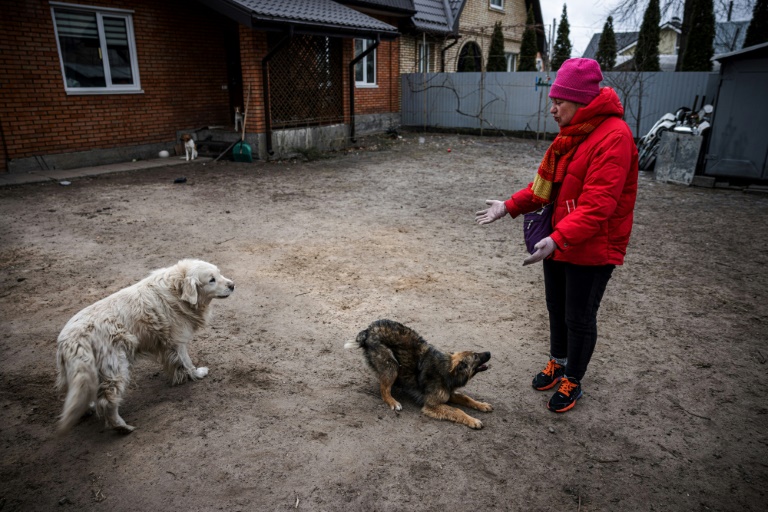 Sa maison a subi de sérieux dégâts. A côté, une autre a été presque entièrement détruite par un missile. Mais cette femme de 54 ans ne peut pas partir: qui nourrirait ses chiens? Elle a les clés d'une maison voisine où se trouvent trois chiots tout excités, un placide Golden Retriever et un berger allemand nerveux. "Celui-ci mord, nous l'avons enfermé dans une cage. Quand nous l'avons trouvé, il était effrayé et tremblait", raconte-t-elle.