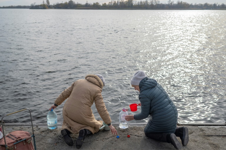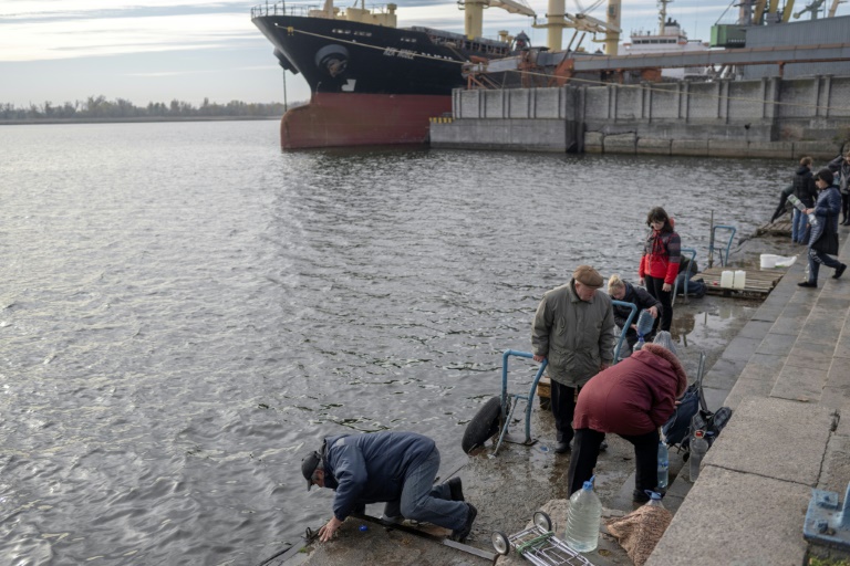 Il faut descendre des marches, se rendre sur un ponton et se pencher périlleusement. Privés d'eau depuis plusieurs jours, des habitants de Kherson, dans le sud de l'Ukraine, vont désormais en puiser dans le fleuve Dniepr qui borde la ville.