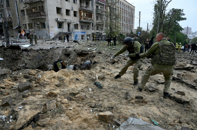 Un photographe de l'AFP a vu ce qui semble être le fragment de l'un des missiles au fond d'un gros cratère dans une rue du centre-ville. De nombreux débris jonchent les rues où des véhicules civils sont retournés ou calcinés.