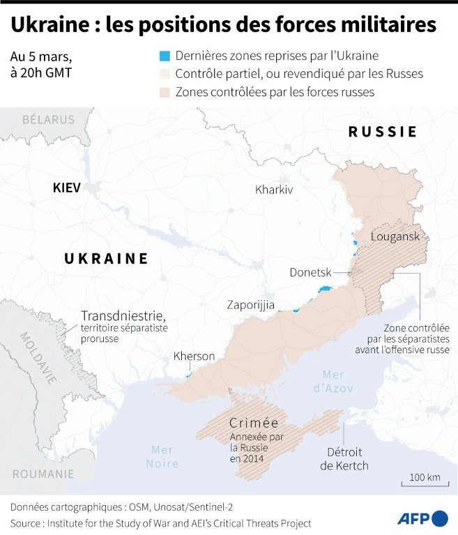 Le dirigeant local de l'occupation russe dans cette région du sud de l'Ukraine, Evguéni Balitski, a dénoncé sur Telegram "un acte terroriste" et "une tentative d'intimidation" à une semaine de l'élection présidentielle russe des 15-17 mars, qui se déroulera aussi dans les territoires occupés.