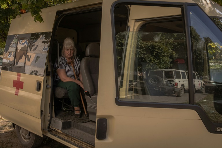 Ă Koupiansk, deux habitantes attendent SerguiĂŻ dans un minibus de la Croix-Rouge.
