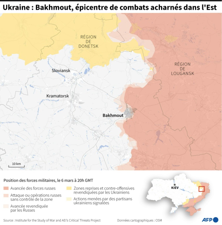 Experts et observateurs doutent de la valeur stratégique de Bakhmout, mais la ville a pris une importance symbolique et tactique, au fil des difficultés des Russes à s'en emparer en plus de sept mois de combats depuis août.