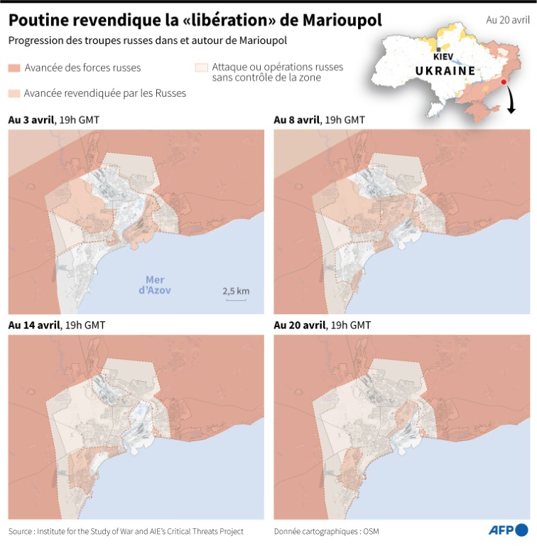 Jeudi, le président russe Vladimir Poutine a déclaré que les forces russes avaient "libéré" Marioupol, ordonnant d'assiéger les derniers combattants ukrainiens plutôt que de donner l'assaut sur le site industriel d'Azovstal où ils sont retranchés.