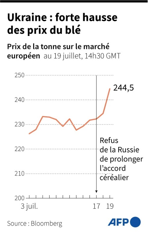 Conséquence du blocage depuis lundi par la Russie du "corridor" sécurisé en mer Noire qui avait été négocié pour exporter par cargos les millions de tonnes de céréales ukrainiennes, le blé a clôturé mercredi à 253,75 euros la tonne sur le marché européen, en hausse de plus de 8%.