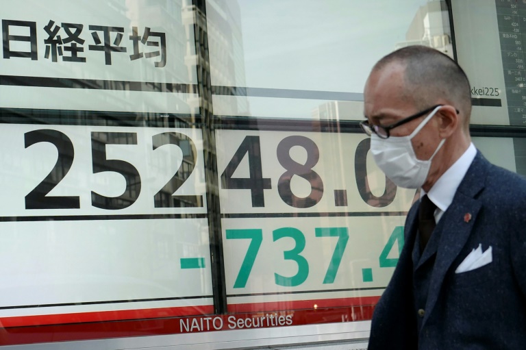 A l'inverse, les marchés d'actions buvaient la tasse: à la Bourse de Tokyo l'indice vedette Nikkei chutait de 3,15% à la pause de mi-séance. A 25.166,23 points, il n'était plus tombé aussi bas depuis fin 2020.