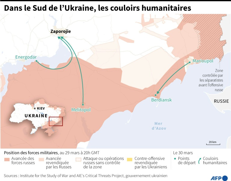 Les bombardements ont détruit au moins 65 immeubles et en ont endommagé 126, selon la même source. Les conditions pour lancer dans les prochains jours une opération humanitaire au secours des habitants de Marioupol ne "sont pas réunies à ce stade", a par ailleurs annoncé mardi soir la présidence française après un entretien entre les présidents français Emmanuel Macron et russe Vladimir Poutine.