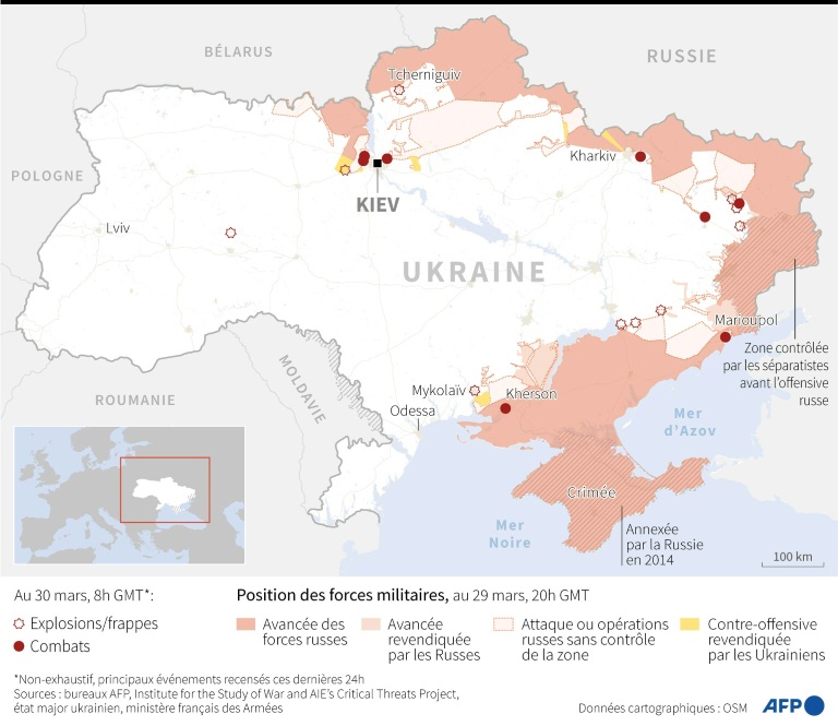 La Russie s'était engagée mardi à l'issue de pourparlers de paix à Istanbul à réduire "radicalement" son activité militaire autour de Kiev et de Tcherniguiv. Le président ukrainien Volodymyr Zelensky avait évoqué des "signaux positifs" même s'ils "ne font pas oublier les explosions ou les obus russes".
