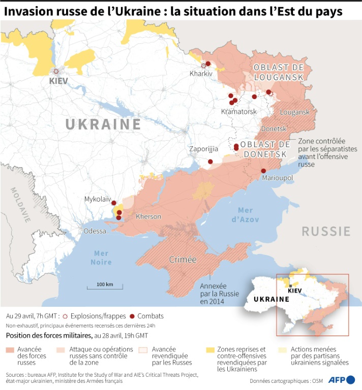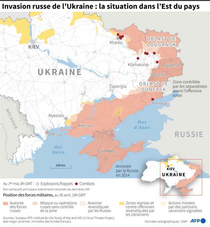 Le ministère russe de la Défense a quant à lui assuré que "grâce à l'initiative du président russe Vladimir Poutine, 80 civils, dont des femmes et des enfants, détenus par des nationalistes ukrainiens, ont été secourus du territoire de l'usine d'Azovstal à Marioupol (...), évacués vers le village de Bezimennoïé dans la République populaire de Donetsk (sous contrôle russe, ndlr), où ils ont reçu un logement, de la nourriture et l'assistance médicale nécessaire".