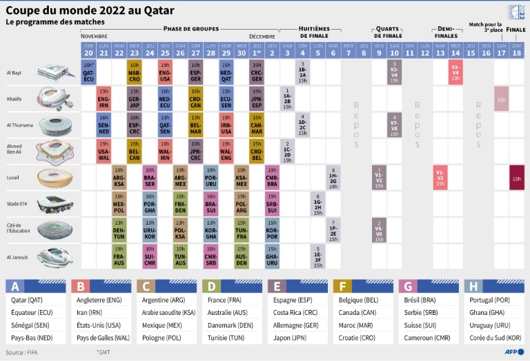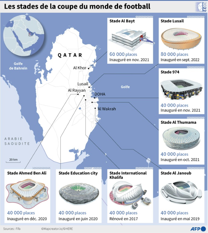 Organisé à l'automne - une autre première - pour éviter les chaleurs insupportables de cette région désertique, le Mondial-2022 s'ouvrira par un Qatar-Equateur inédit dans le stade d'Al Bayt, le plus éloigné de Doha, à une quarantaine de kilomètres au nord de la capitale.