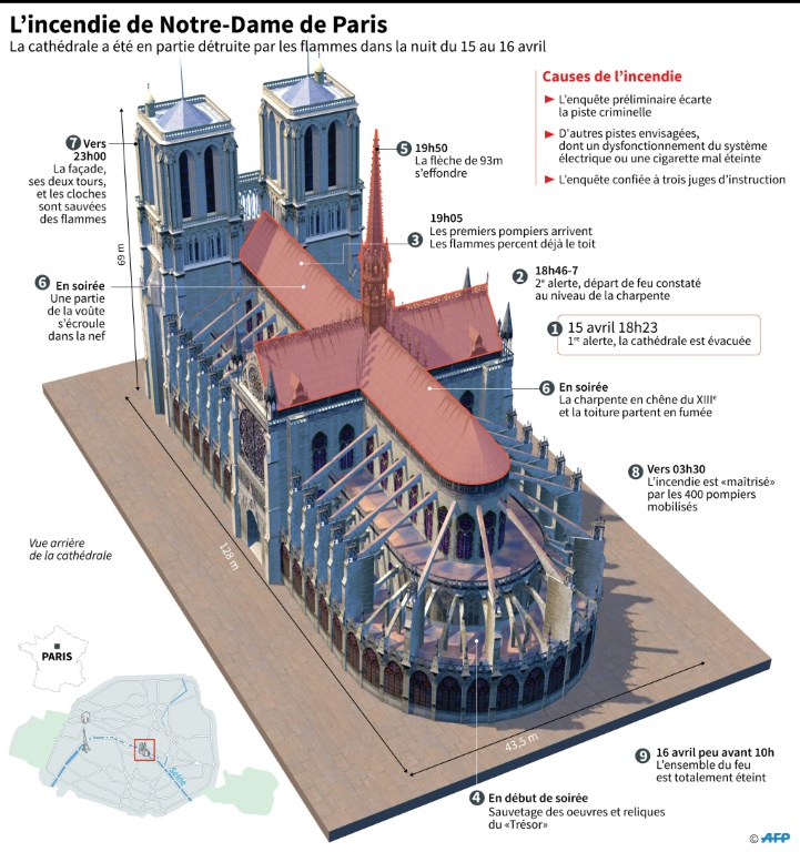 Notre-Dame, joyau gothique orpheline de sa flèche, sans charpente, avec une voûte fragilisée, dont l'incendie a ému le monde, reste en "urgence absolue" selon l'équipe qui veille sur elle, même s'il est très improbable qu'elle s'écroule. Autour du parvis ceinturé de barrières, les touristes japonais, chinois ou américains ont cessé de venir faire des selfies.