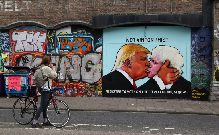 Donald Trump et Boris Johnson s'embrassant passionnément sur un mur de Bristol (ouest): le graffiti a été conçu par un mouvement pro-UE souhaitant mettre en garde contre les conséquences potentielles d'un Brexit après le référendum du 23 juin au Royaume-Uni.