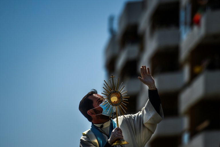 Suivant lentement une statuette de la Vierge de Fatima posée sur le toit de la voiture ouvrant cette procession originale, il a ainsi pu "aller à la rencontre des gens tout en respectant les règles" de distanciation sociale en vigueur à cause de la pandémie de coronavirus. "J'ai ressenti le besoin de dire aux gens qu'ils ne sont pas seuls et qu'ils n'ont pas été abandonnés, en leur amenant des paroles de réconfort et de foi", a expliqué à l'AFP ce curé de 48 ans en charge de deux paroisses de la commune de Oeiras, située à l'ouest de la capitale portugaise.