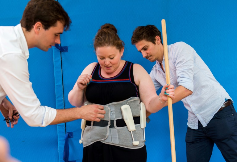 En fonction des mouvements de la patiente détectés par les capteurs, les moteurs déclenchent des vérins qui poussent la partie supérieure du tronc, pour soulager la pression du poids du corps sur les disques lombaires. "On sent qu'on est libéré d'un certain poids, ça tire la colonne vertébrale. On est soulagé au niveau de ce tassement lombaire et ça aide en mouvement, on se sent plus léger", commente Mme Krajewski.