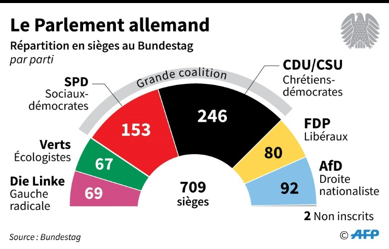 L'AfD, elle, attend son heure: "La facture arrivera au plus tard en 2021", a prévenu Alice Weidel, co-présidente du groupe parlementaire du parti d'extrême droite. A cette date, a-t-elle assuré, son parti sera devenu la deuxième force d'opposition en Allemagne.