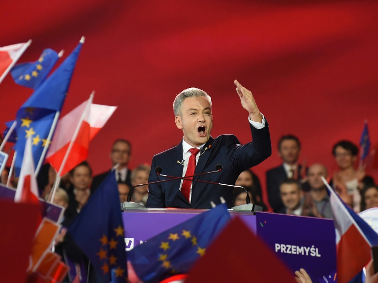 Selon un sondage publié vendredi par l'institut IBRiS dans le contexte des européennes, son parti naissant est soutenu par 6,4% des Polonais, ce qui le situe à la troisième place, certes loin derrière le parti conservateur Droit et Justice (PiS) au pouvoir, appuyé par 36,2% des électeurs, et la Plateforme Civique (PO, opposition centriste libérale), qui obtient 29,6%.