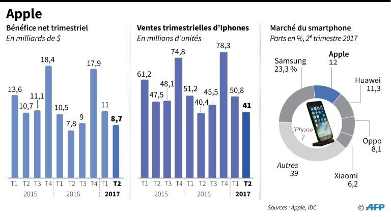 Selon les analystes, la firme à la pomme devrait lancer un appareil haut-de-gamme, baptisé "iPhone X", à prononcer "10" en l'honneur des dix ans du mobile, qui a révolutionné le secteur et s'est déjà écoulé à plus d'1,2 milliard d'exemplaires.