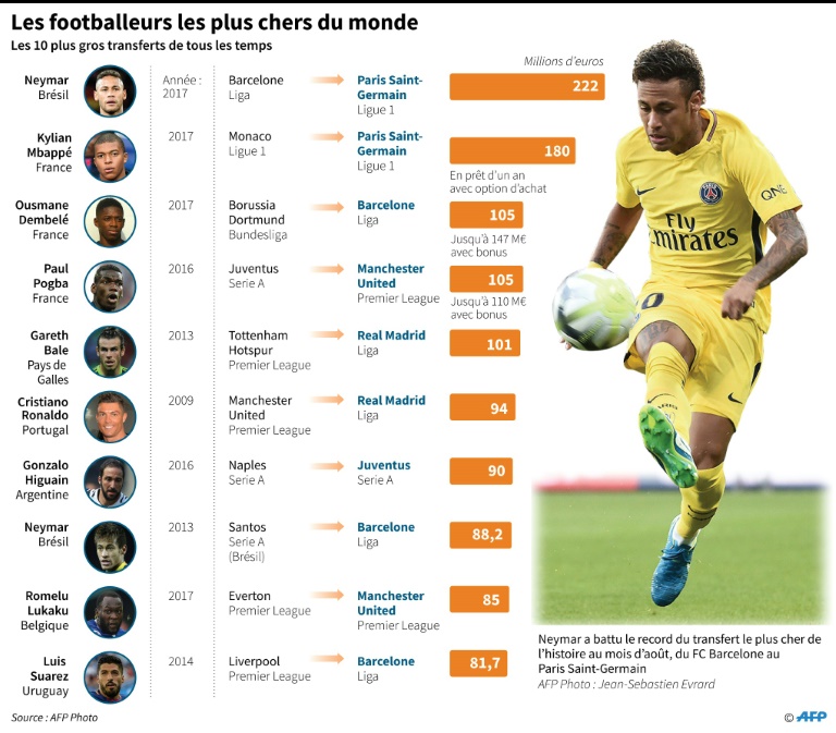Neymar pour 222 M EUR, Mbappé pour 145 (+ 35 M EUR de bonus), Dembelé pour 105 (+ 42 de bonus): le mercato d'été 2017 restera dans l'histoire et a parlé la langue de Molière, avec Paris et deux joueurs français dans le top 3 des transferts les plus chers de l'histoire.