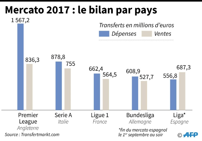 En dehors de la France, la Premier League avec les rivaux de Manchester, United et City, a encore frappé fort avec 1,5 milliard d'euros d'achat selon le cabinet Deloitte. Soit une augmentation de 23% par rapport à l'été précédent, mais sans vivre "au dessus de ses moyens" selon les analystes. Les 85 M EUR dépensés pour Romelu Lukaku (ex-Everton) par Manchester United ont marqué les esprits. Ca aurait pu être plus spectaculaire encore, puisque les médias anglais assurent qu'Arsenal était prêt à offrir 100 M EUR dans les dernières heures du marché jeudi soir pour Thomas Lemar (Monaco).