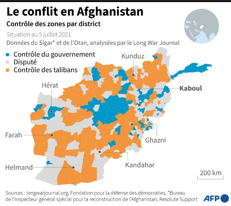 La troupe "est perdue. Dans presque chaque district dont ils s'emparent, les talibans envoient des délégations de notables pour convaincre les soldats de se rendre", explique-t-il. Face à des soldats désormais privés du crucial soutien aérien américain, les talibans ont intensifié leurs offensives ans le Nord ces derniers jours, s'emparant du gros des provinces du Badakhshan et du Takhar, où les troupes gouvernementales ne contrôlent désormais qu'à peine plus que les capitales provinciales.