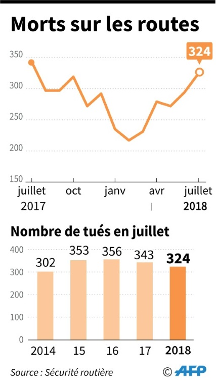 En juillet, 324 personnes sont mortes sur les routes de France métropolitaine (344 en incluant l'Outremer), soit 19 de moins qu'en juillet 2017 (-5,5%), selon les données publiées vendredi par la Sécurité routière.
