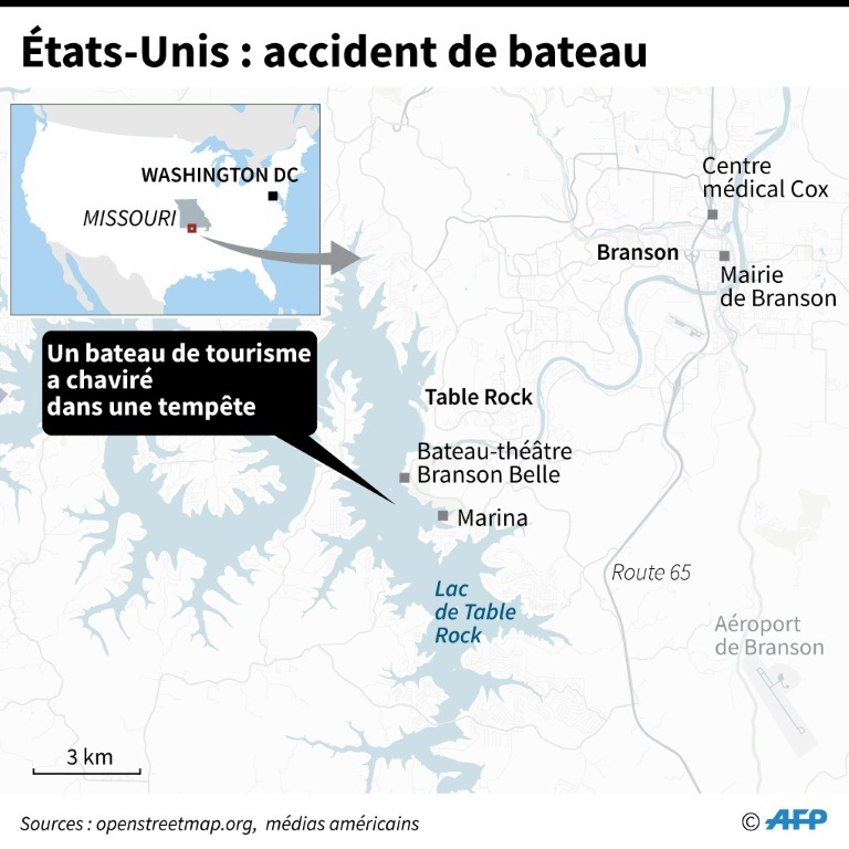 Plusieurs personnes ont réussi à regagner seules le rivage, a-t-il ajouté. Les opérations de secours, interrompues par la nuit, devaient reprendre vendredi matin avec la participation de plongeurs pour retrouver les disparus. Parmi les blessés, deux se trouvent dans un état critique, selon la branche locale du Cox Medical Center, une structure hospitalière privée implantée dans le Missouri.
