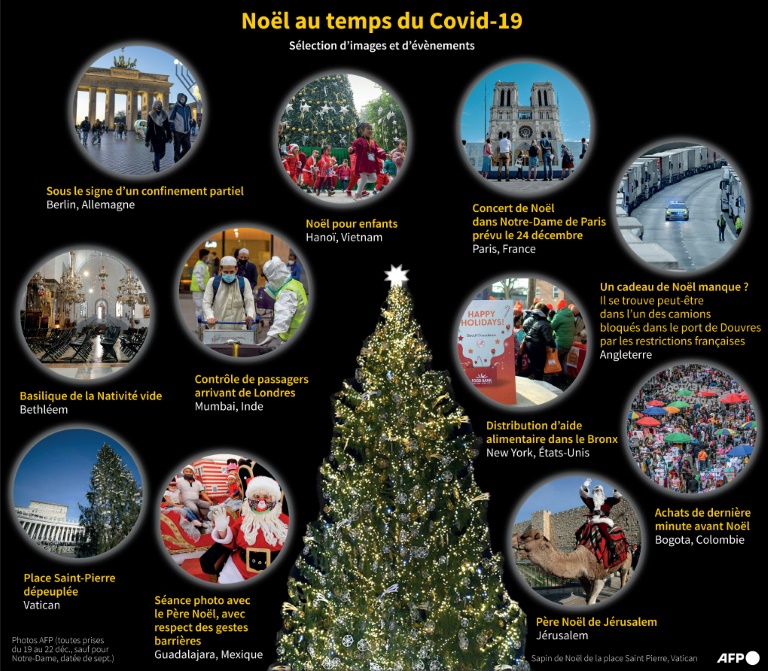 C'est un Noël à nul autre pareil qui se prépare jeudi dans les pays le célébrant, les festivités se trouvant un peu partout restreintes, voire plombées, par un cortège de restrictions ordonnées pour lutter contre la pandémie. Le coronavirus a fait plus de 1,7 million de morts sur les cinq continents, et les foyers de contamination qui continuent d'apparaître rappellent qu'en dépit de l'arrivée des premiers vaccins, la vie ne retrouvera pas de sitôt son cours normal.