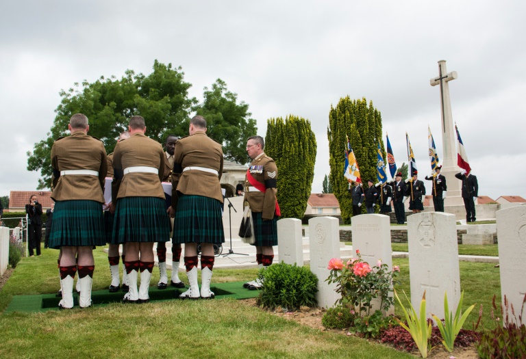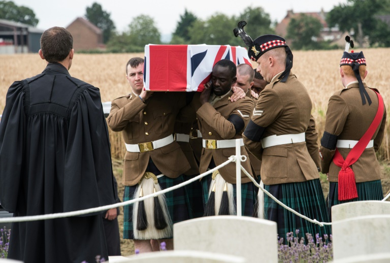 Lors de l'enterrement, une quinzaine de soldats de la Black Watch, habillés en kilt, ont tiré des salves, tandis que les hymnes anglais et français ont retenti après des poèmes et des prières en l'honneur de cet engagé volontaire, tué à 29 ans par une mine.