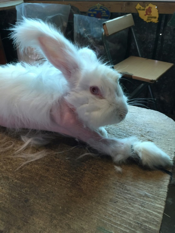 "Nous utilisons de la paille pour les litières, afin que les lapins soient plus confortables. Contrairement au mohair, qui nécessite des chèvres très jeunes, le plus bel angora vient d'animaux matures vers 5-6 ans, selon M. Clouet.