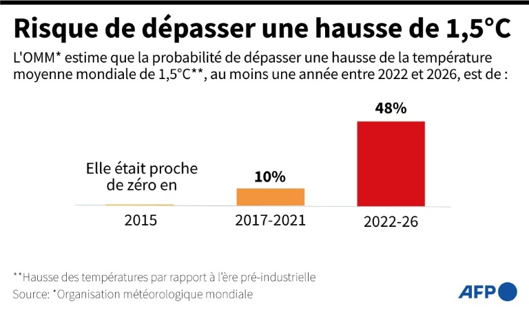 Pour les années comprises entre 2017 et 2021, la probabilité de dépassement était de 10%. Elle est passée "à près de 50% pour la période 2022-2026", indique l'OMM. Mais il n'y a qu'une faible probabilité (10%) que la moyenne quinquennale dépasse le seuil de +1,5°C.