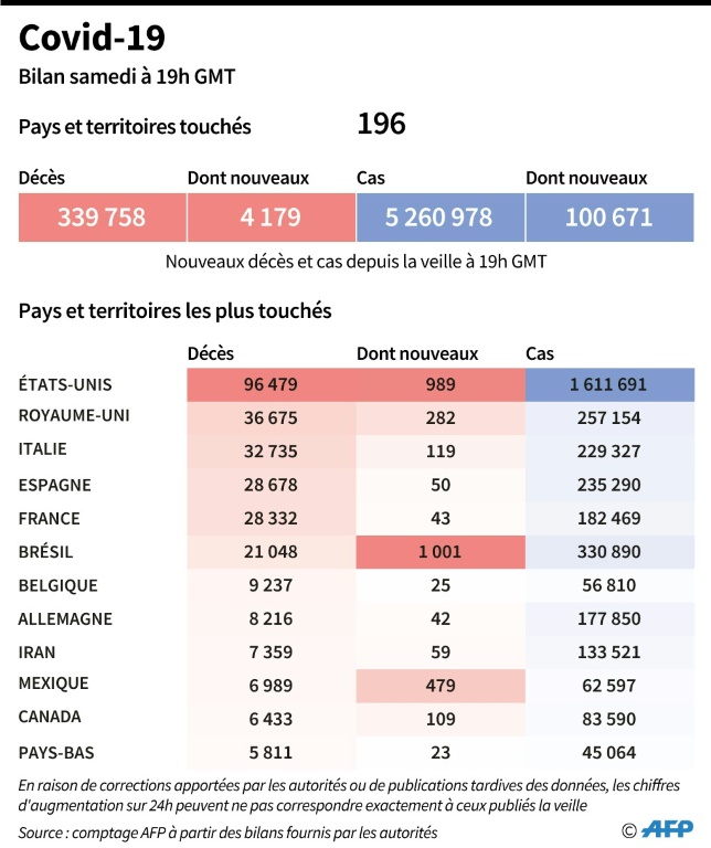 Avec des chiffres sans doute très sous-évalués, la pandémie a officiellement touché plus de 5,26 millions de personnes dans le monde. Elle a fait au moins 339.758 morts depuis son apparition en décembre en Chine, d'après un bilan établi par l'AFP à partir de sources officielles samedi à 19H00 GMT.